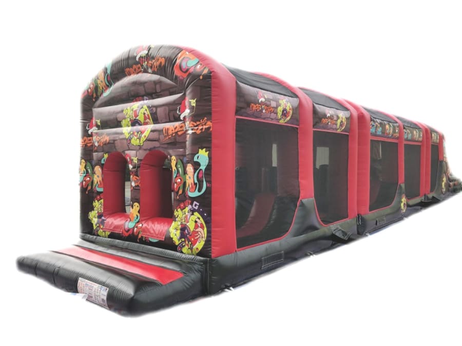 Experience the ultimate thrill with our Red and Black 65ft Graffiti Assault Course, a visually striking inflatable adventure designed for maximum excitement. Stretching over 60 feet, this dynamic obstacle course features a variety of obstacles, including inflatable tunnels, climbing walls and a slide, providing a challenging and engaging experience for individuals or teams.